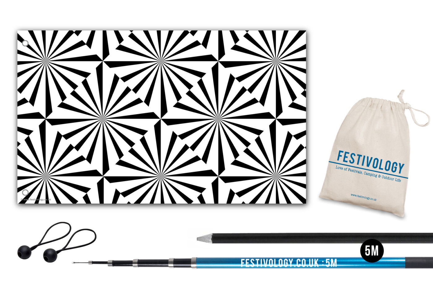 Kit includes flag (and re-useable cotton storage bag), telescopic pole, ground stake and 2 bungees.